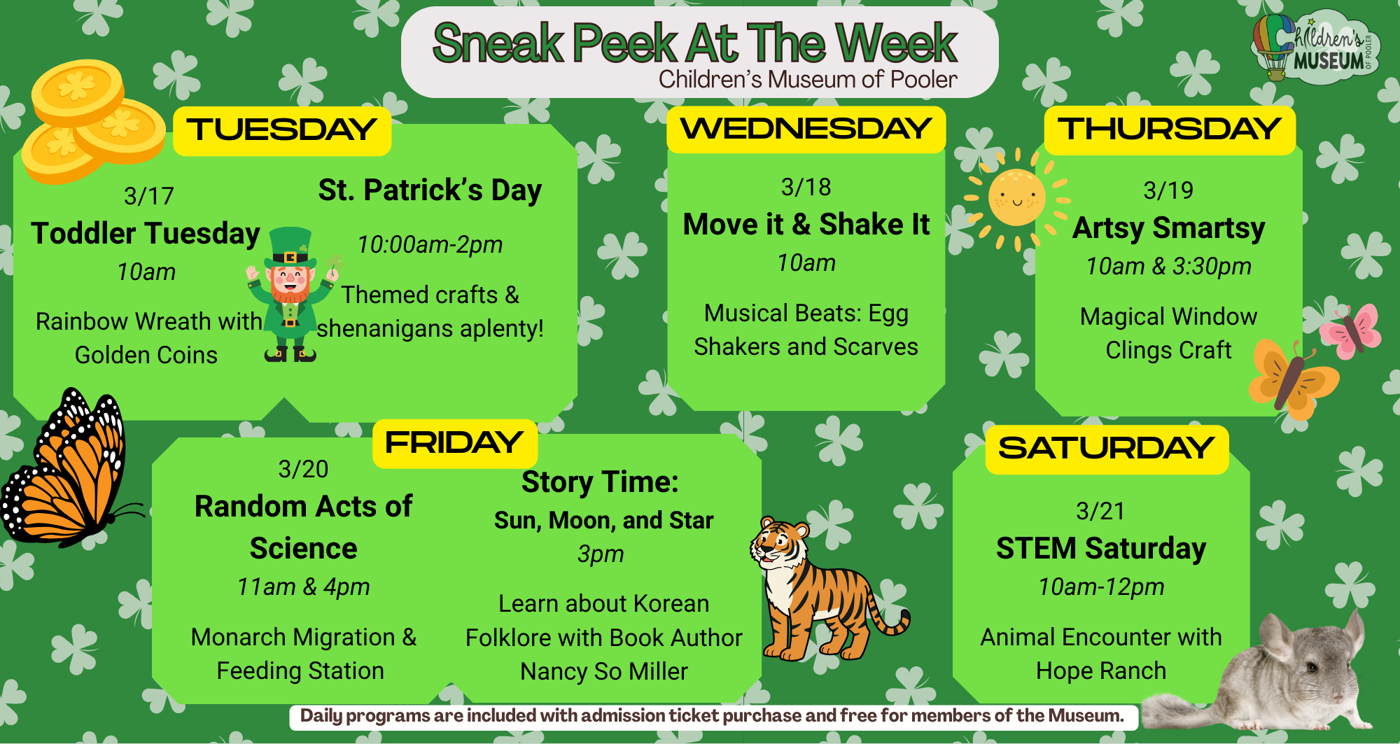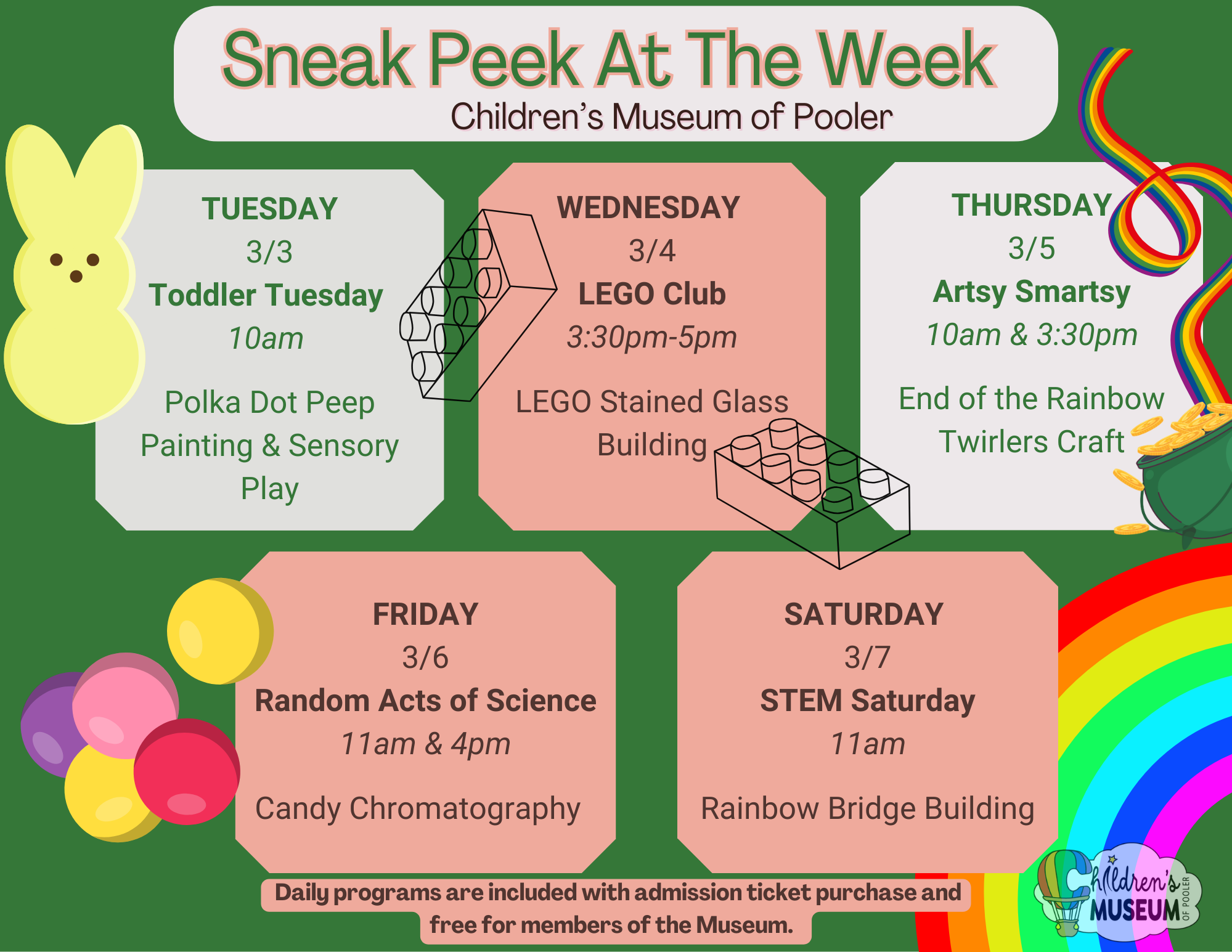 Join us at the Children’s Museum of Pooler for a shamrockin’ good time filled with hands-on St. Patrick’s Day fun! Kiddos can design and build their own leprechaun trap, search for hidden gold at the end of the rainbow in a festive scavenger hunt, and create colorful rainbow-inspired crafts.